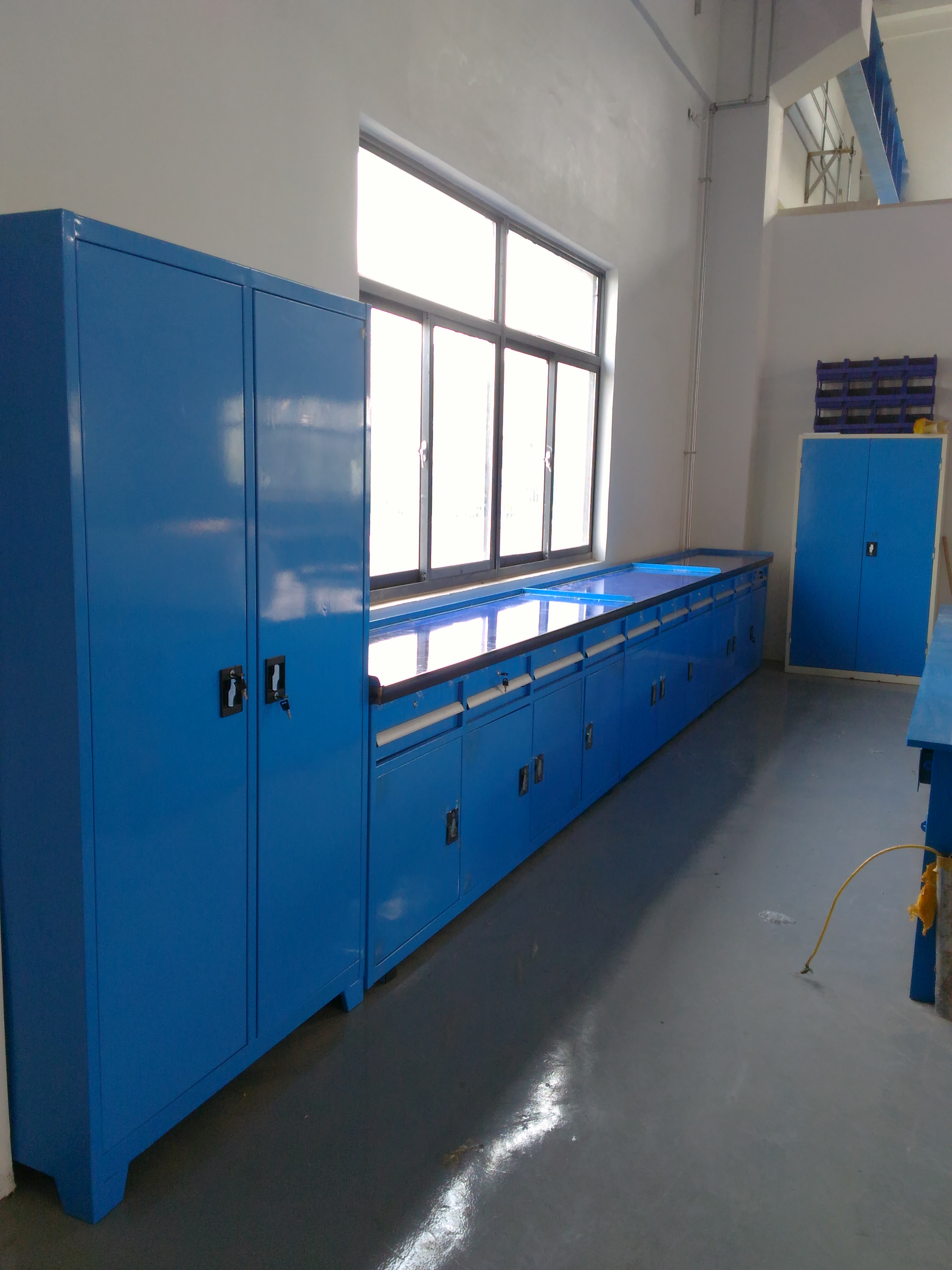 工作桌、鐵板工作桌、置物柜排放整齊漂亮